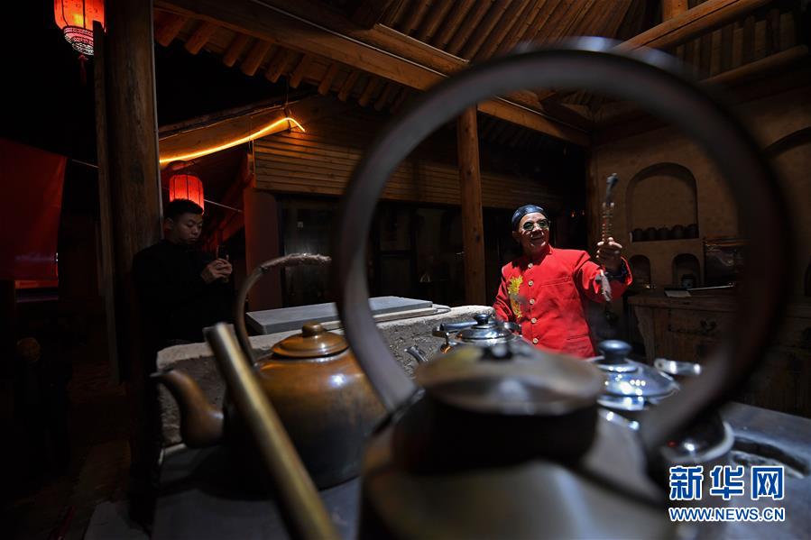 10月20日,在岚山根景区内,茶馆的工作人员在表演。 新华社记者 杨晨光 摄