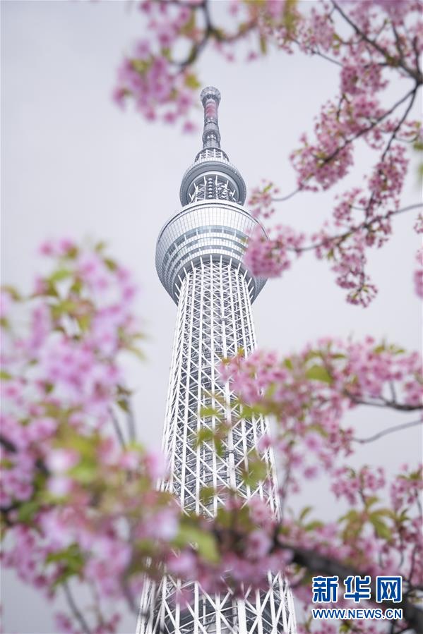 这是2019年3月16日在日本东京拍摄的河津樱和晴空塔。 新华社记者 杜潇逸 摄