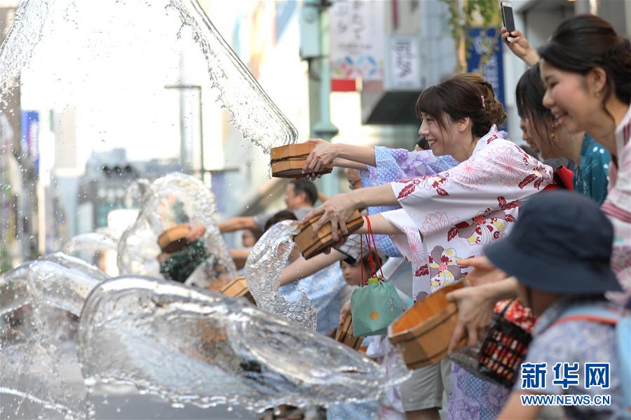 这是2019年8月3日,在日本东京银座,人们身着传统服装参加泼水活动,为街道降温,带来夏日里的一丝清凉。 新华社记者 杜潇逸 摄