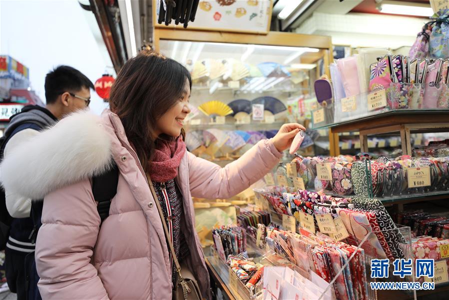 这是2019年2月8日,在日本东京浅草,游客在商店街上选购商品。 新华社记者 杜潇逸 摄