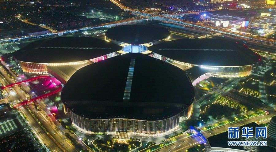 第二届中国国际进口博览会举办场地——国家会展中心(上海)(10月27日无人机拍摄)。 2019年11月5日,第二届中国国际进口博览会将在上海开幕。 夜幕下的国家会展中心(上海)灯光璀璨,流光溢彩,静待八方宾客。 新华社记者 丁汀 摄 |