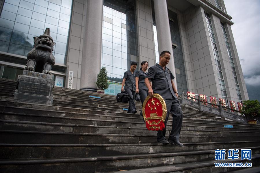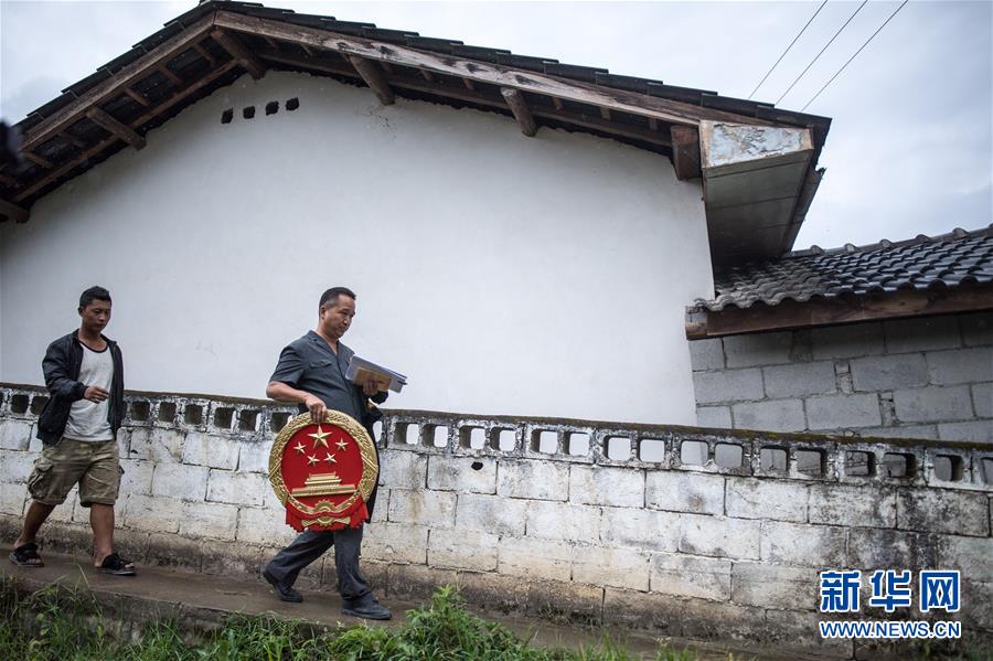 贡山县人民法院法官邓兴(右一)带着国徽前往乡间设立巡回法庭(8月31日摄)。新华社记者 江文耀 摄