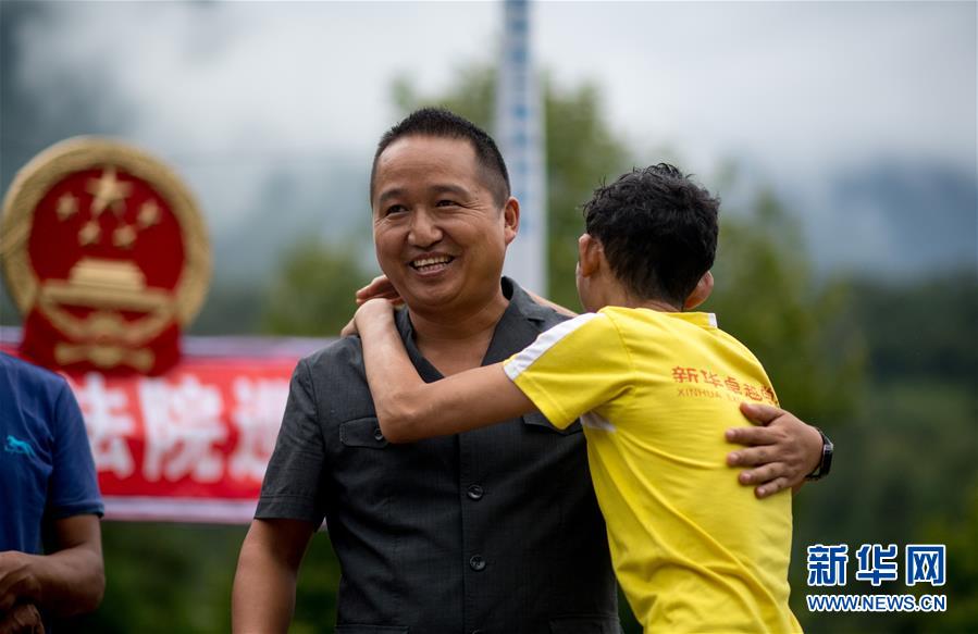 调解成功后,当事人与贡山县人民法院法官邓兴拥抱(8月30日摄)。新华社记者 江文耀 摄