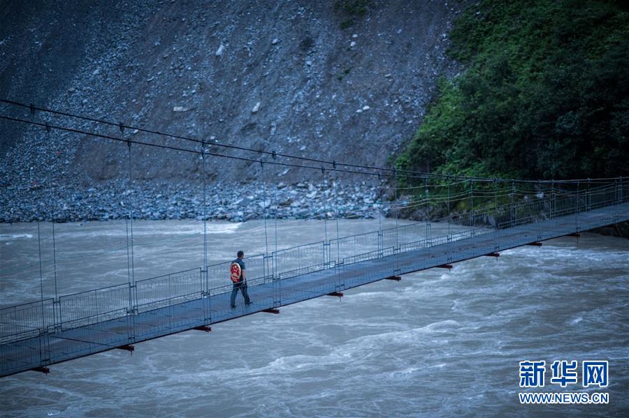 贡山县人民法院法官邓兴背着国徽跨过怒江(8月30日摄)。新华社记者 江文耀 摄