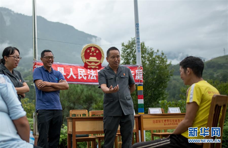 贡山县人民法院法官邓兴与同事们在丙中洛镇进行现场调解(8月30日摄)。新华社记者 江文耀 摄