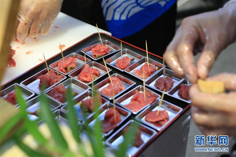 新 11月7日,来自日本长崎鱼市株式会社的专业切鱼师傅在现场解体70公斤蓝鳍金枪鱼。 第二届中国国际进口博览会正在上海国家会展中心举行。博览会的食品及农产品展区里汇集了来自世界各地的美食,同时也上演各种精彩美食秀。11月7日,来自日本长崎鱼市株式会社的专业切鱼师傅现场解体一条70公斤的蓝鳍金枪鱼,吸引大量参观者观看、品尝。 新华社记者 隋先凯 摄
