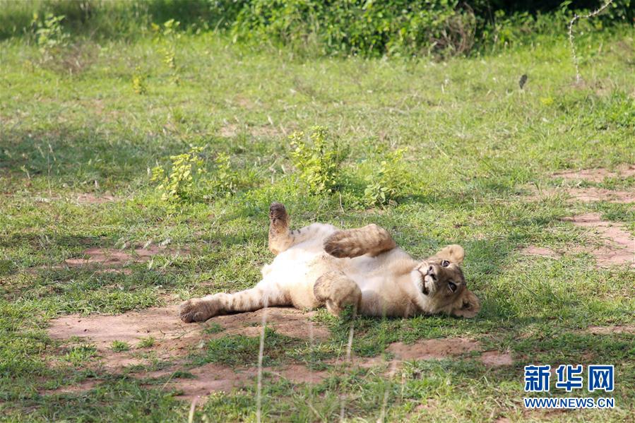 11月17日,在卢旺达阿卡盖拉国家公园,一头幼狮躺在地上。新华社记者吕天然 摄
