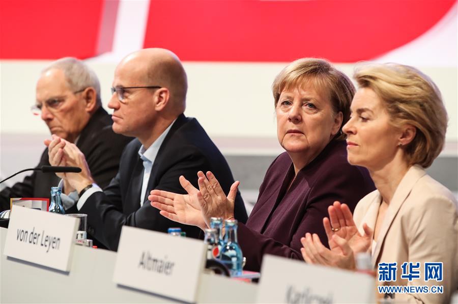 11月22日,在德国莱比锡,欧盟委员会当选主席冯德莱恩(右一)、德国总理默克尔(右二)、德国联邦议院联盟党党团主席布林克豪斯(左二)与德国联邦议院议长朔伊布勒出席德国基督教民主联盟(基民盟)全国党代会。 德国基民盟22日至23日在莱比锡举行全国党代会。 新华社记者 单宇琦 摄