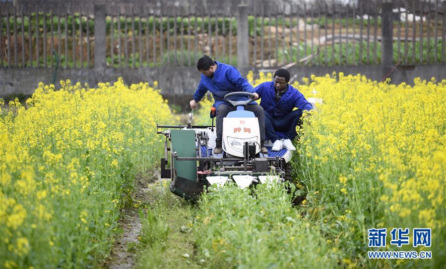 在湖南农业大学油菜机械起垄栽培试验田里,楚柯(右)坐在农机上查看油菜生长状况(3月14日摄)。楚柯来自喀麦隆,是湖南农业大学农业机械工程专业的硕士研究生。新华社记者 李尕 摄