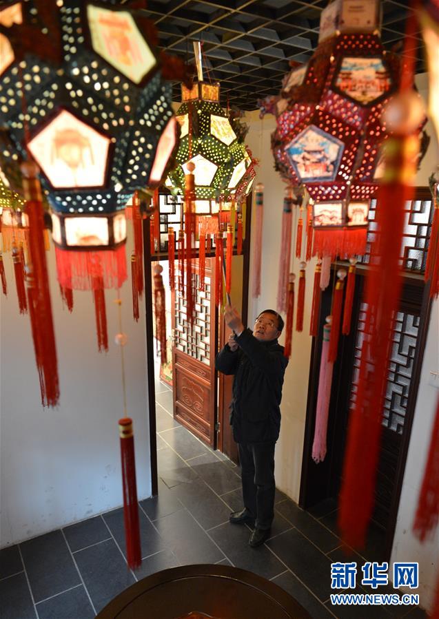11月27日,在“汴京灯笼张”彩灯展览馆,张俊涛将制作好的灯笼挂起。新华社记者 任鹏飞 摄