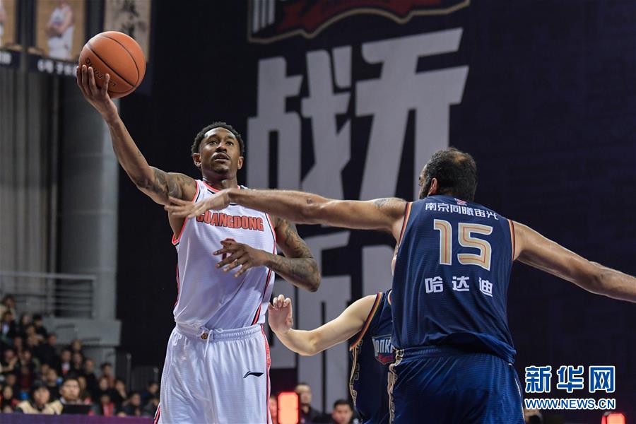 11月26日,广东东莞银行队球员布鲁克斯(左)在比赛中上篮。 当日,在2019-2020赛季中国男子篮球职业联赛(CBA)常规赛第10轮比赛中,南京同曦宙光队主场以91比116不敌广东东莞银行队。 新华社记者李博摄