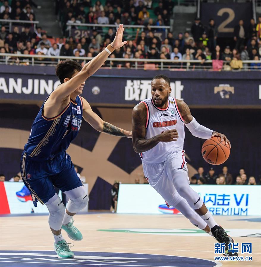 11月26日,广东东莞银行队球员威姆斯(右)在比赛中突破。 当日,在2019-2020赛季中国男子篮球职业联赛(CBA)常规赛第10轮比赛中,南京同曦宙光队主场以91比116不敌广东东莞银行队。 新华社记者李博摄