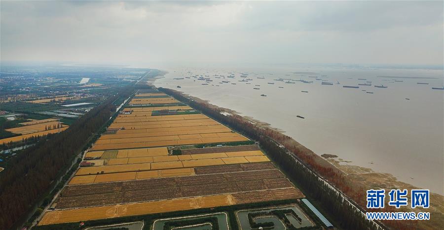 地处长江入海口的崇明岛西北端,众多往来船只航行在长江上(11月28日无人机拍摄)。