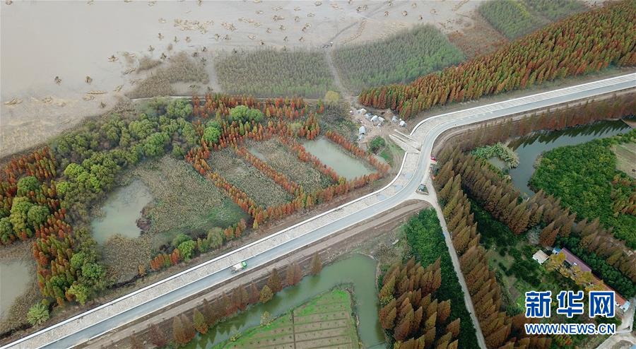 地处长江入海口的崇明岛西北端,一条环岛景观道路正在施工中(11月28日无人机拍摄)。 新华社记者 方喆 摄