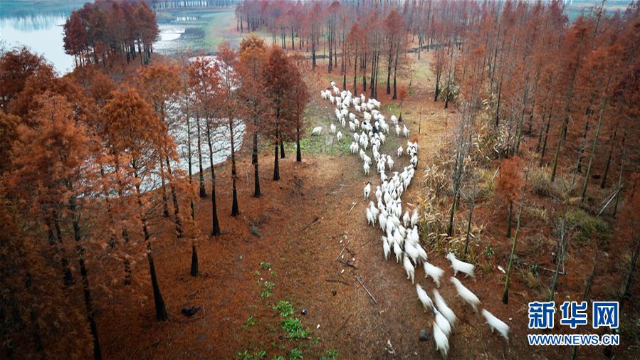 11月27日,牧归的羊群行走在红杉林中。 新华社记者 杨磊 摄