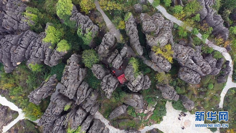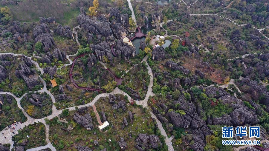 这是云南石林彝族自治县黑石箐石林景观(11月28日无人机拍摄)。 初冬时节,云南省石林彝族自治县黑石箐景区内一千多种中药材生长在婀娜多姿的原始石林间,形成独特的景观,吸引众多游人前来观赏。 新华社记者 胡超 摄