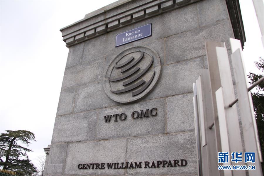这是12月11日在瑞士日内瓦拍摄的世贸组织总部大门上的世贸标识。新华社记者 刘曲 摄