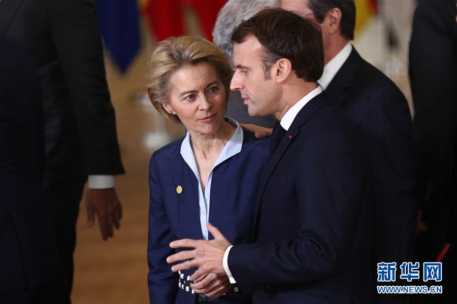 12月12日,在比利时布鲁塞尔的欧盟总部,欧盟委员会主席冯德莱恩(左)与法国总统马克龙在欧盟冬季峰会合影仪式后交谈。 当日,2019年欧盟冬季峰会在比利时布鲁塞尔的欧盟总部举行。 新华社记者 郑焕松 摄