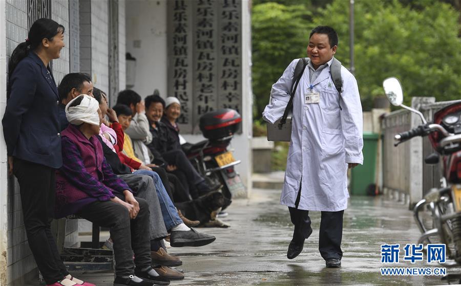 5月28日,何永清(右)一大早出门“送医上门”后回到村卫生室时,门口排满了等待就诊的村民。何永清是陕西省略阳县乐素河镇瓦房村卫生室的一名村医,幼年时因车祸失去右臂。2006年7月从汉中市卫校毕业后,他选择回到山大沟深的秦岭腹地故乡工作。十多年来,何永清坚守在基层卫生第一线,乡亲们亲切地称他为“我们的独臂村医”。新华社记者陶明摄