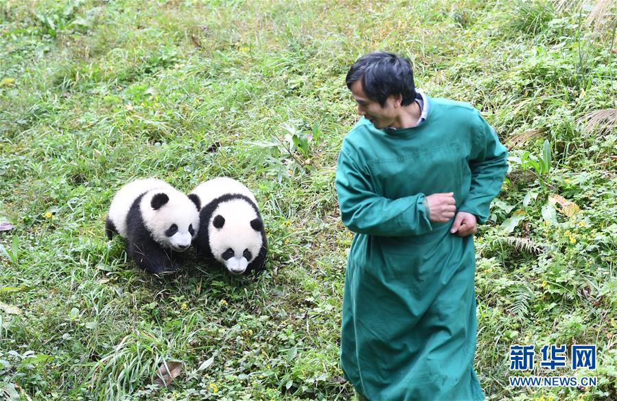 12月22日,饲养员引导大熊猫宝宝到户外运动。 当日,重庆动物园为4只大熊猫宝宝“双双”“重重”“喜喜”“庆庆”举行半岁生日庆祝活动。4只半岁大熊猫在饲养员的照料下,在熊猫馆运动场内玩耍、嬉戏,与市民游客一同过冬至。 新华社记者 唐奕 摄