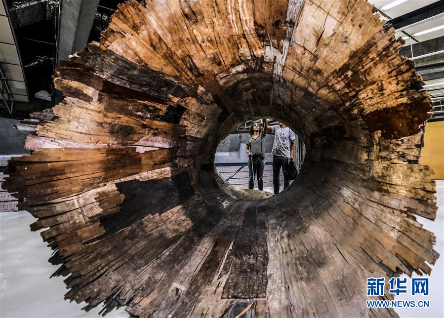 10月29日,在巴西圣保罗市艺术中心,一名丈夫帮助盲人妻子抚摸一件名为“树干”的艺术品。 新华社记者 兰红光 摄