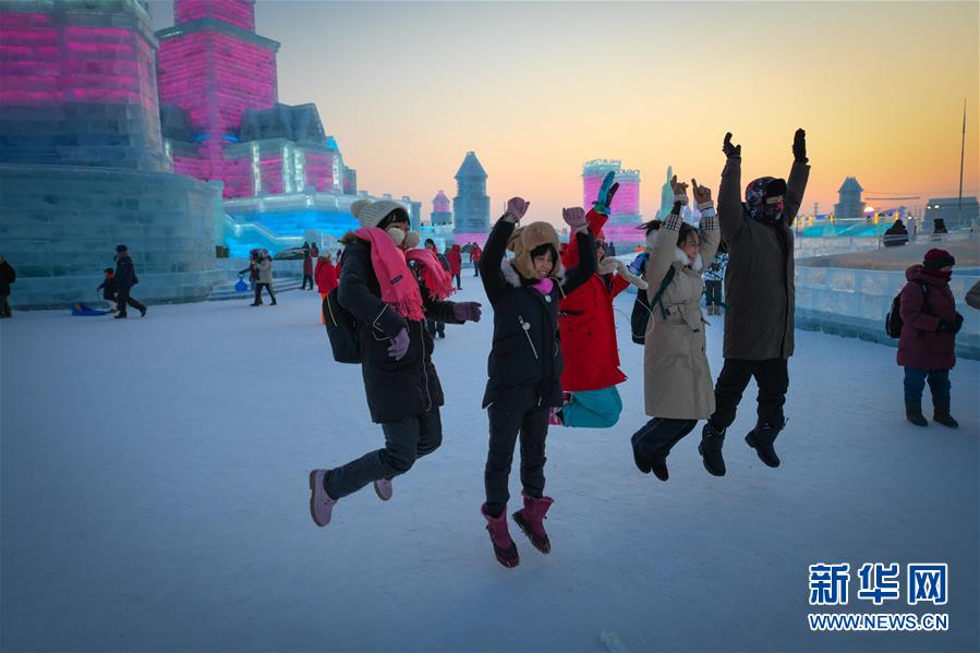 游客在哈尔滨冰雪大世界园区中游玩(1月5日摄)。 每到冬季,天气寒冷的冰城哈尔滨陆续迎来各类冰雕雪雕赛事。从2019年12月7日起,采冰工人们日夜采冰运冰、冰景雪雕艺术家精心雕琢,这些“冰雪造梦者”们在严寒天气中辛苦付出,让一座“冰雪之城”在松花江畔拔地而起,向来自世界各地的游客展现浪漫绚丽的冰雪奇观。 新华社记者 王松 摄