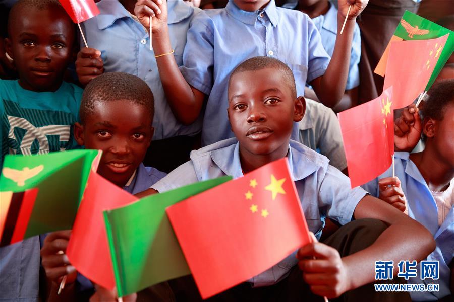 这是2019年6月13日,在赞比亚卢萨卡省琼圭区,手持中赞两国国旗的儿童参加中国援非“万村通”赞比亚项目竣工仪式。“万村通”项目是2015年中非合作论坛约翰内斯堡峰会提出的中非人文领域合作举措之一,旨在为非洲国家的1万个村庄接入卫星数字电视信号。新华社记者 彭立军 摄