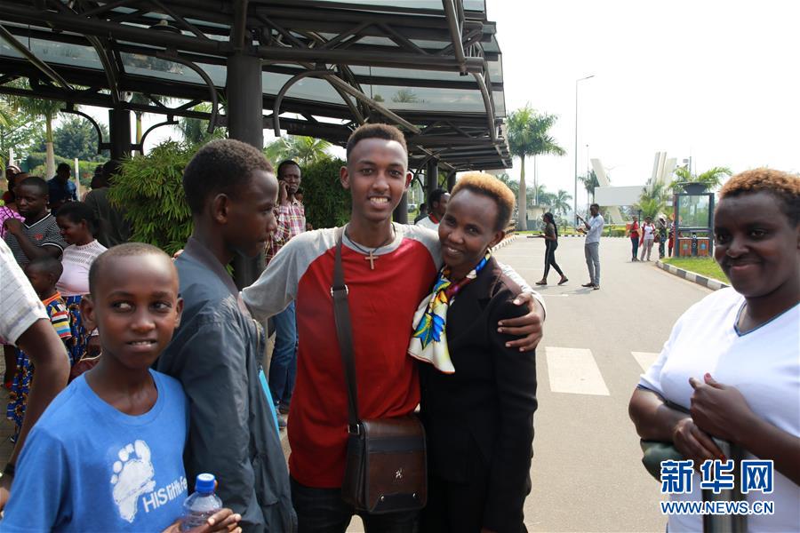 2019年9月9日,在卢旺达基加利国际机场,即将前往中国的卢旺达小伙迈克·曼齐(中)与亲友告别。迈克·曼齐将用4年时间在杭州全面学习互联网、国际贸易和跨境电商相关内容,特别是中国电商经验。 新华社记者 吕天然 摄
