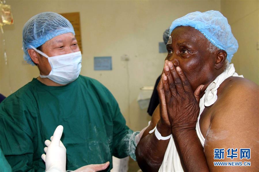 2010年11月23日,在津巴布韦首都哈拉雷郊区的奇通圭扎中心医院,一位老人(右)在中国“非洲光明行”医疗队为其实施复明手术后重见光明,惊喜万分。新华社记者 李平 摄