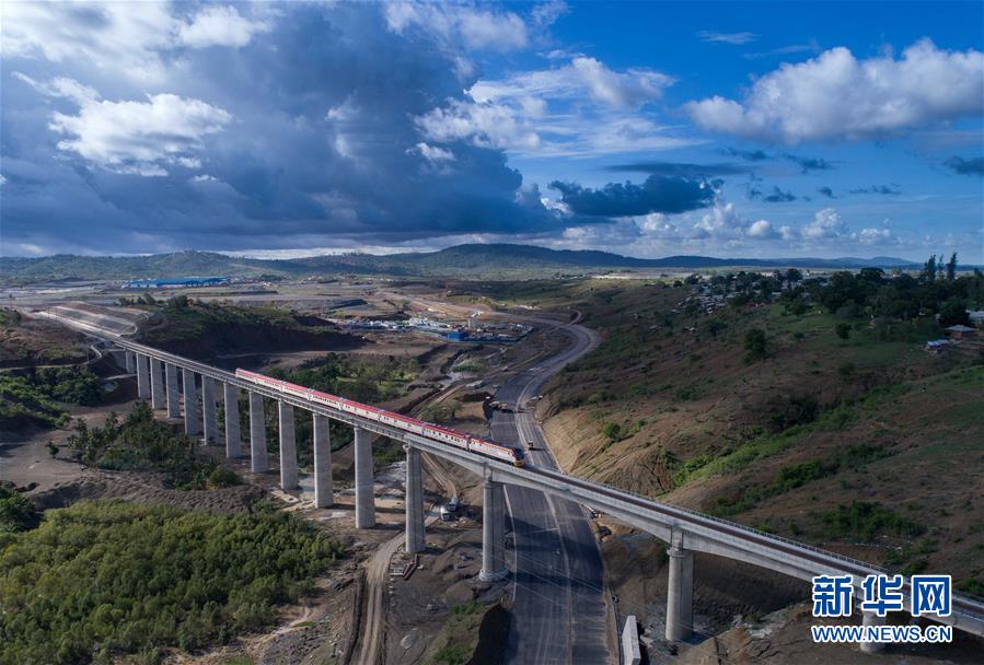 2016年10月3日,在埃塞俄比亚首都亚的斯亚贝巴附近,一列试运行列车在中国企业建设的亚吉铁路上行驶。新华社记者 孙瑞博 摄