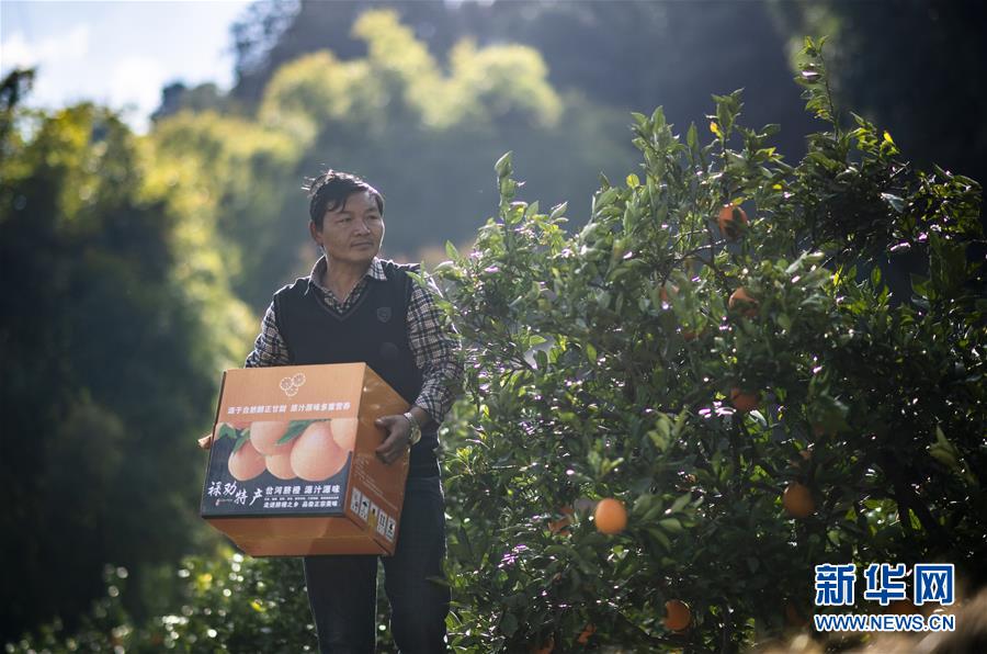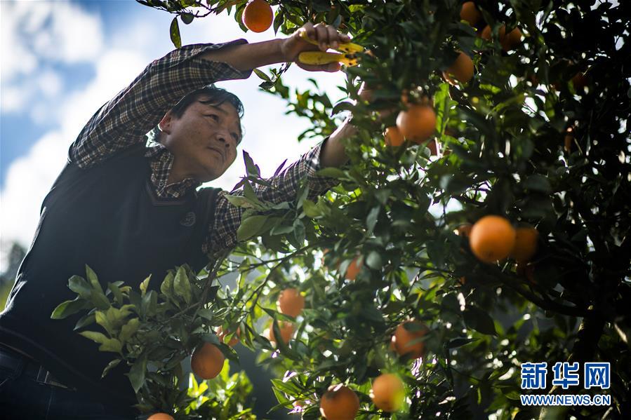 1月8日,云南省昆明市禄劝彝族苗族自治县屏山街道岔河村农户宋玉才在采收脐橙。 当日,产自云南省昆明市禄劝彝族苗族自治县屏山街道岔河村的脐橙正式向澳门发货,首批1000公斤脐橙将于下周一运抵澳门。 新华社记者 江文耀 摄