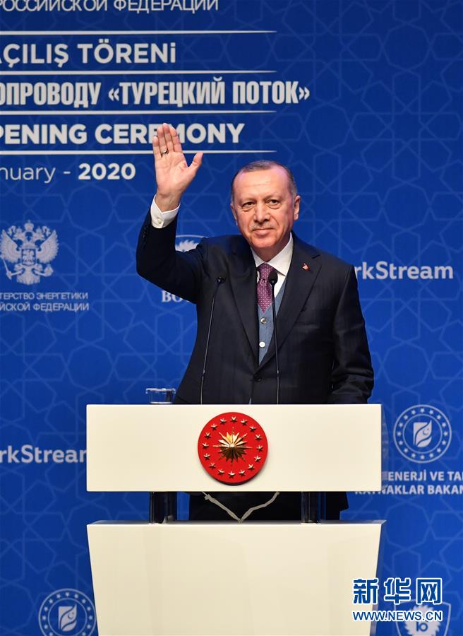 1月8日,在土耳其伊斯坦布尔,土耳其总统埃尔多安在“土耳其溪”天然气管道通气仪式上发言。土耳其总统埃尔多安与到访的俄罗斯总统普京、保加利亚总理鲍里索夫和塞尔维亚总统武契奇共同出席“土耳其溪”天然气管道通气仪式。新华社记者 徐速绘 摄