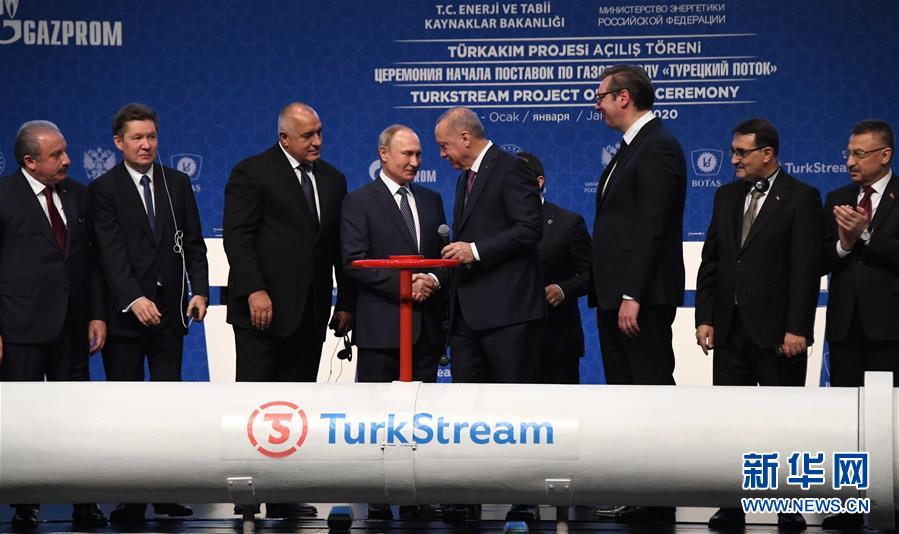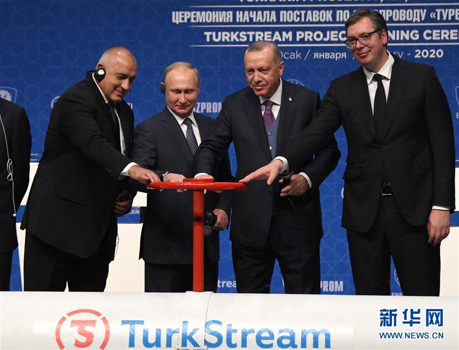 土耳其总统埃尔多安与到访的俄罗斯总统普京、保加利亚总理鲍里索夫和塞尔维亚总统武契奇共同出席“土耳其溪”天然气管道通气仪式。