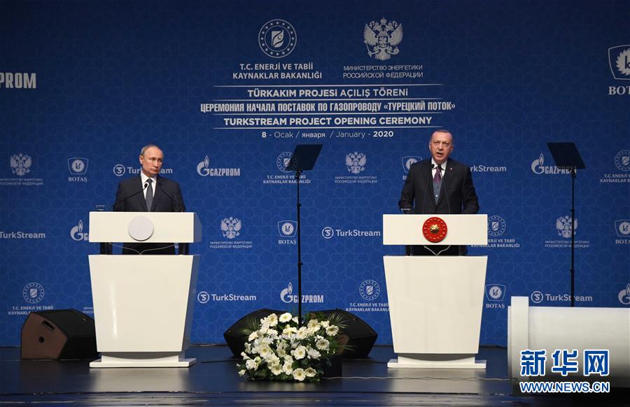 1月8日,在土耳其伊斯坦布尔,土耳其总统埃尔多安(右)与俄罗斯总统普京参加“土耳其溪”天然气管道通气仪式。新华社记者 徐速绘 摄