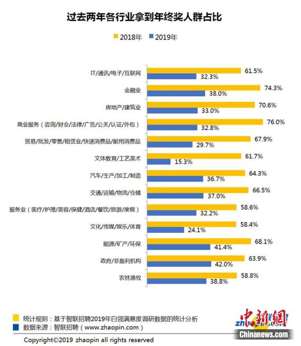 2020-01-15 18:23:58 来源:中国新闻网 责任编辑:李雅兰 作者:吴涛中新网客户端北京1月15日电(记者 吴涛) 15日,智联招聘网站发布的调研数据显示, 2019年全国白领年终奖的平均值为9547元,较之2018年的7100元有大幅增长。 不过阳光普照式的年终奖现象减少,仅33.3%能拿到年终奖,而2017年与2018年的数据分别为66.1%与55.17%,能拿到年终奖的白领占比持续下滑。 报告调查显示,还有15.3%的白领表示年终奖“据说有,不确定”,确定必定与年终奖无缘的白领占到了40%,相比2018年的22.30%高出近一倍。