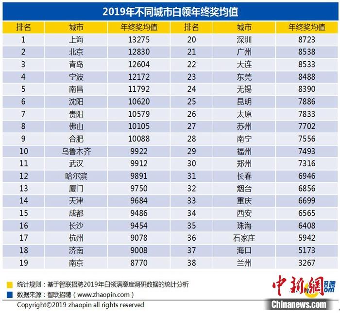 各地年终奖平均值。图片来源:智联招聘 上海白领年终奖平均13275元,领先全国 报告显示,2019年度年终奖发放最高的城市是上海,上海白领的年终奖平均金额达13275元,包括上海在内,一共有9城市年终奖平均金额过万。 其余8个城市分别是:北京(12830元)、青岛(12604元)、宁波(12172元)、南昌(11792元)、沈阳(10620元)、贵阳(10579元)、佛山(10105元)、合肥(10088元)。 而年终奖平均金额最低的城市是兰州,平均金额仅为3267元,上海白领的年终奖平均金额超过兰州白领的4倍。