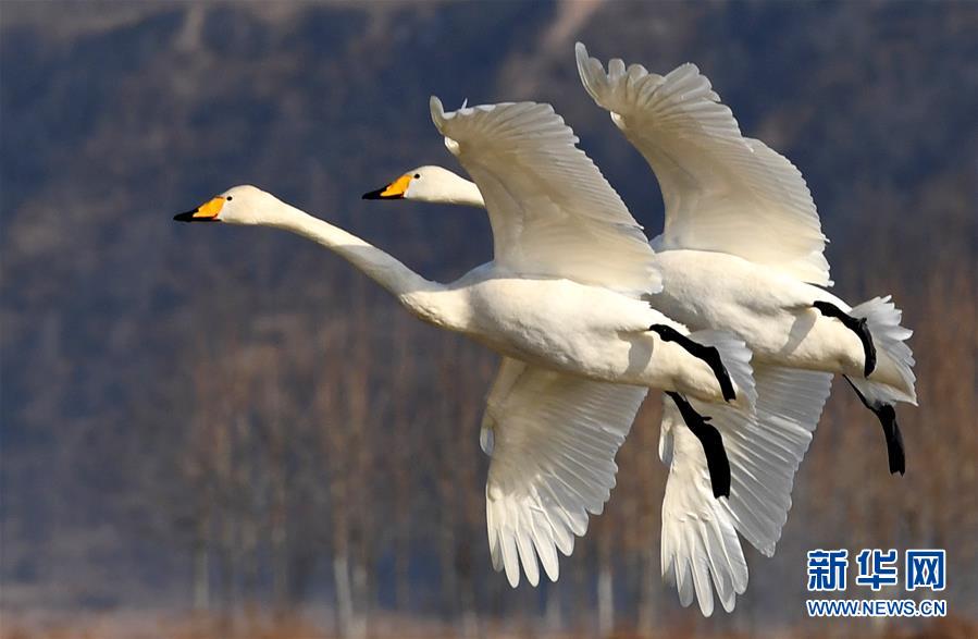 白天鹅在三门峡黄河湿地上空飞翔(1月20日摄)。 进入冬季,大批白天鹅在河南省三门峡市黄河湿地栖息越冬。近年来,当地大力推进黄河湿地生态建设,加强白天鹅保护力度,来此越冬的白天鹅数量逐年增加。 新华社记者 朱祥 摄