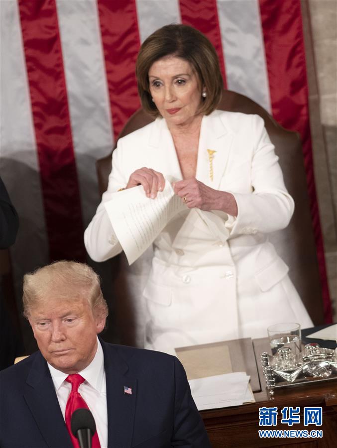 2月4日,在美国首都华盛顿,美国总统特朗普(前)在国会发表国情咨文演讲后,国会众议院议长、民主党人佩洛西(后右)将讲稿副本撕毁。 新华社记者刘杰 摄