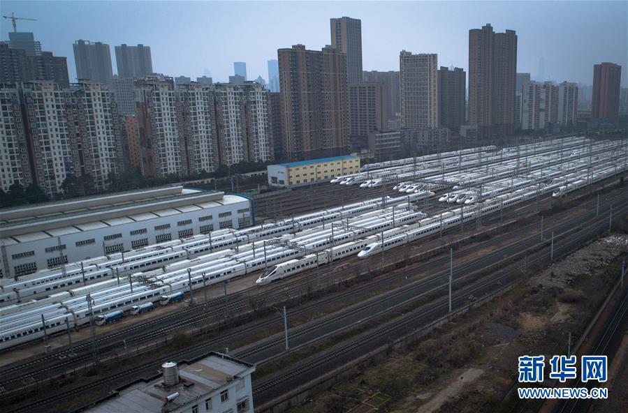 2月10日,动车组列车停放在武汉动车段的存车线上(无人机照片)。 为全力打好新冠肺炎疫情防控阻击战,最大限度防止疫情通过铁路途径传播和扩散,按照铁路部门运输方案,目前湖北境内始发、终到列车和中国铁路武汉局集团公司值乘的列车已全部停运或调整,中国铁路武汉局集团公司配属的200余组动车组除少量用作检测和热备以外,其余全部停放在武汉动车段存车线上。 新华社记者 肖艺九 摄