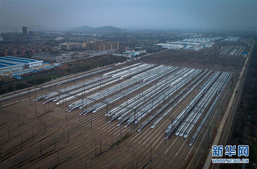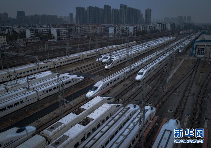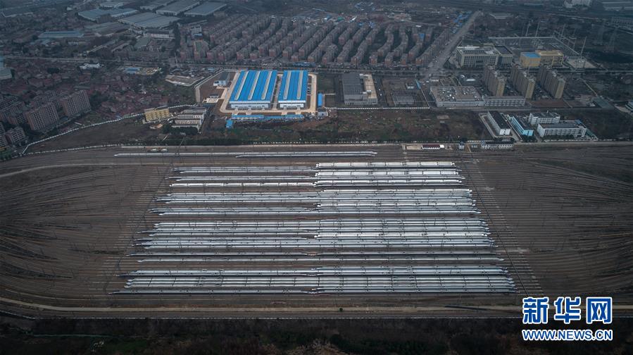 2月10日,动车组列车停放在武汉动车段的存车线上(无人机照片)。 为全力打好新冠肺炎疫情防控阻击战,最大限度防止疫情通过铁路途径传播和扩散,按照铁路部门运输方案,目前湖北境内始发、终到列车和中国铁路武汉局集团公司值乘的列车已全部停运或调整,中国铁路武汉局集团公司配属的200余组动车组除少量用作检测和热备以外,其余全部停放在武汉动车段存车线上。 新华社记者 肖艺九 摄