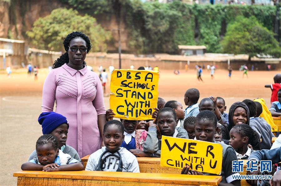 2月19日,在肯尼亚内罗毕,马萨雷贫民窟的小学生展示标语牌,表达对中国的关心和祝福。标语牌上写着:中国,我们和你在一起。 中国和非洲虽然距离遥远,但民心相通,当地民众关注着中国抗击新冠肺炎疫情的消息。在一些国家,孩子们拿起画笔,描绘出他们对中国的支持和鼓励,送上远方的真挚祝福。