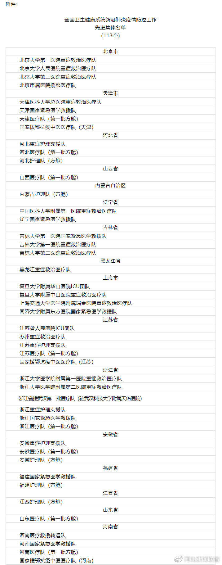 2020-03-05 13:27:58 来源:央视新闻 责任编辑:李雅兰 作者:国家卫健委今天表示,经各方面艰苦努力,疫情防控形势出现积极变化,向好态势不断拓展。为鼓舞士气,表彰先进,弘扬正气,激励广大卫生健康工作者投入这场严峻的斗争,国家卫生健康委、人力资源和社会保障部、国家中医药管理局决定授予北京大学第一医院重症救治医疗队等113个集体“全国卫生健康系统新冠肺炎疫情防控工作先进集体”称号,授予丁新民等472位同志“全国卫生健康系统新冠肺炎疫情防控工作先进个人”称号,追授徐辉等34位同志“全国卫生健康系统新冠肺炎疫情防控工作先进个人”称号,获奖个人享受省部级表彰奖励获得者待遇。 国家卫健委要求各地切实落实中央应对新冠肺炎疫情工作领导小组《关于全面落实进一步保护关心爱护医务人员若干措施的通知》精神,把党中央的关怀和温暖传递给每一位奋战在一线的卫生健康工作者,激励他们始终保持强大的战斗力、昂扬的斗志和旺盛的精力,坚决打赢疫情防控的人民战争、总体战、阻击战。