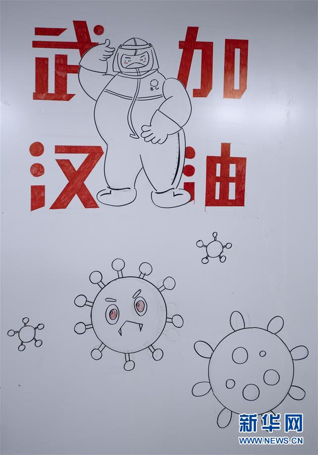 3月4日,在武汉雷神山医院,来自金域医学的陈丹在画画。 雷神山医院建成后,各地医疗队进驻这里,全力以赴救治患者。 雷神山医院走道间的墙,逐渐成为医护人员和工作人员表达内心感受的窗口,他们在此画画、写字...... 温情的笔触、有力的画笔,寄托了美好的祝愿,也展示了他们战胜疫情的信念与决心! 新华社记者 程敏 摄