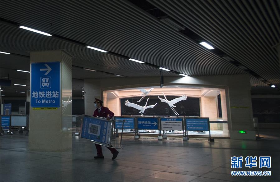 3月23日,在汉口火车站地铁站,工作人员将进站的二维码牌搬运至进站口。 新华社记者 肖艺九 摄