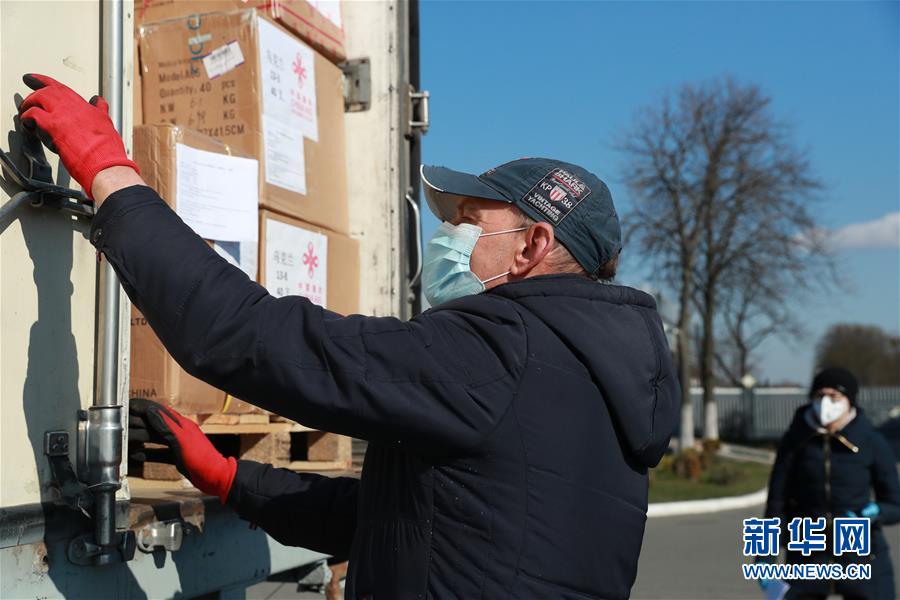 4月1日,在乌克兰基辅,工作人员将中国政府援助乌克兰的人道主义抗疫物资装车。 中国政府援助乌克兰的人道主义抗疫物资1日抵达基辅。据乌克兰卫生部3月31日晚发布的疫情数据,31日乌克兰新冠肺炎确诊病例新增97例,累计确诊病例645例,累计死亡病例17例。 新华社记者 李东旭 摄