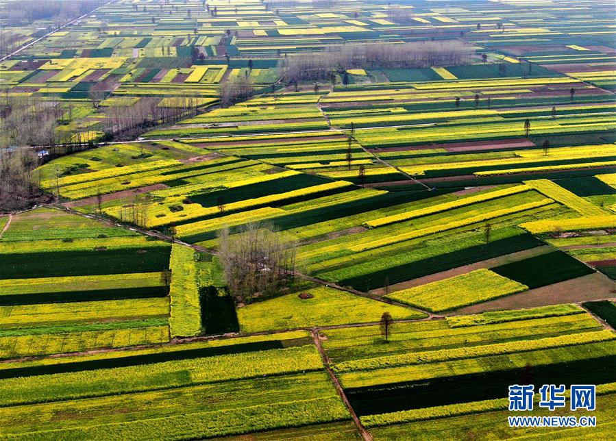 这是河南省淮滨县毛庄村的田园风光(3月30日摄,无人机照片)。 近日,河南省淮滨县毛庄村淮河岸边的大片油菜花盛开,构成一幅生机勃勃的春日图景。 新华社记者 李安 摄
