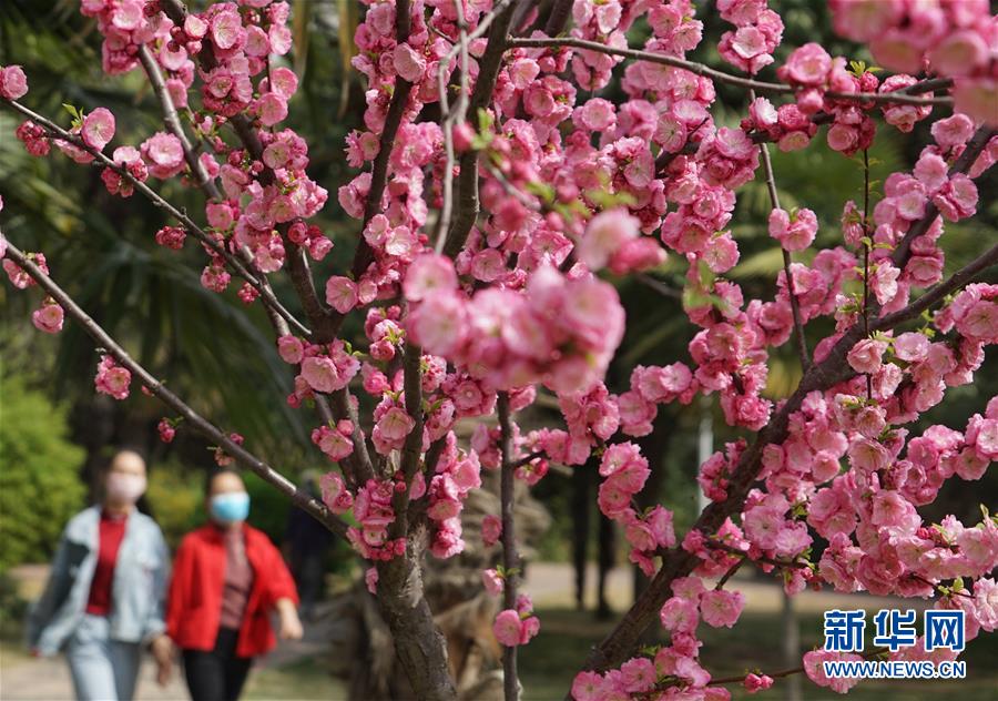 近日,河南省郑州市各公园鲜花绽放,一些市民在做好防护的前提下走出家门,享受春光。新华社记者 李安 摄