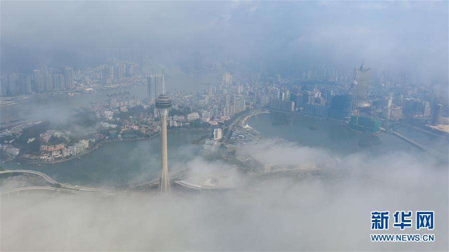 澳门旅游塔一带的景色(3月22日摄,无人机照片)。 初春的澳门,雾气氤氲,楼宇漂浮在云雾间,美不胜收。 新华社记者 张金加 摄