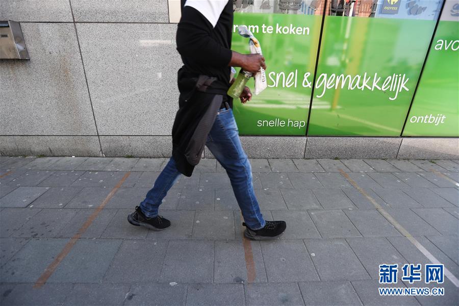 4月6日,在比利时布鲁塞尔,一名男子经过一家超市门口地上的排队标识线。 比利时国家公共卫生研究所6日发布公报说,比利时新冠肺炎确诊病例累计已达20814例,死亡1632例。 新华社记者 郑焕松 摄