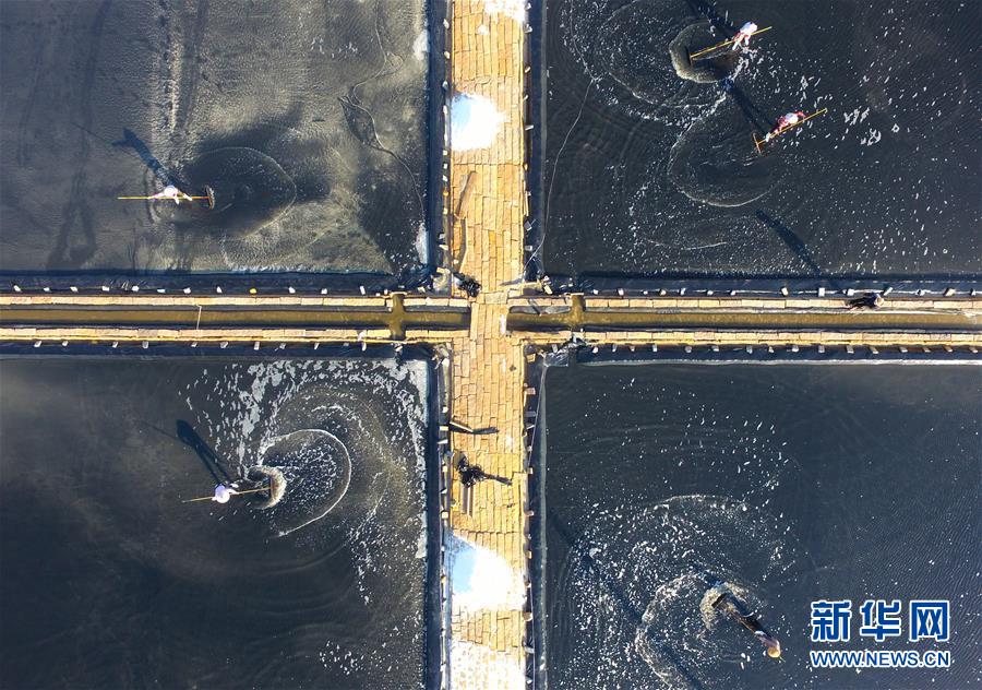 4月27日,莆田盐场的工人在晒盐池里忙碌(无人机照片)。 莆田盐场位于福建省莆田市秀屿区东峤镇,辛勤劳作的盐工、纵横交错的晒盐池,共同构成如画的风景。 新华社记者 魏培全 摄